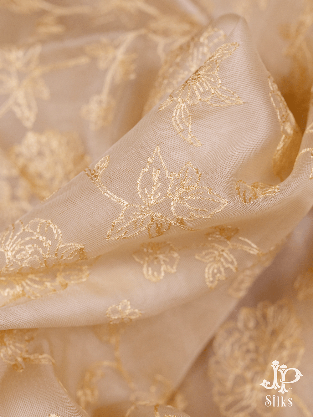 Color: Bask in the warm and inviting hues of beige gold, accentuated by intricate floral embroidery work that graces the entire saree.