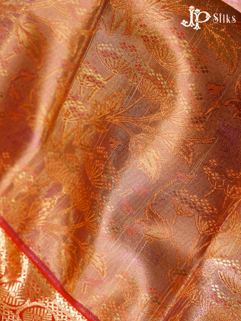 A stunning drape in rust-pink with gold zari weaves, adorned with floral and chakram motifs framed by a striking zigzag zari border. The red pallu dazzles with thilagam, mango, and peacock designs, while the plain blouse with matching border completes this elegant, festive look.