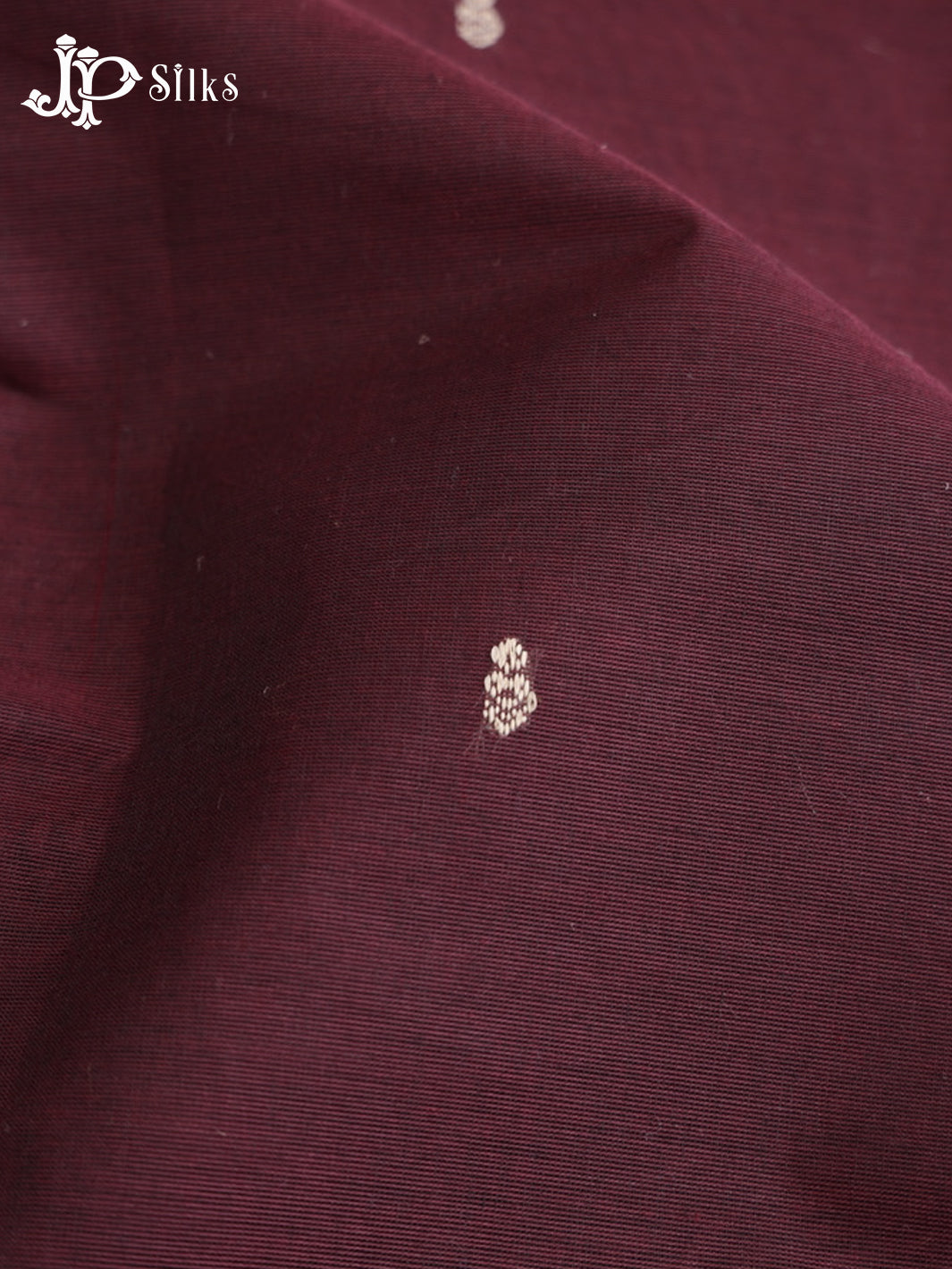 Bold Dark Pink Theni Cotton Saree from JP Silks features a vibrant dark pink body adorned with small buttas in thread weave, enhanced with chakram and zigzag designs in a gold zari border that adds striking traditional elegance. Dark pink pallu detailed with stripe lines and small buttas in thread weave brings lively continuity and graceful charm. This saree comes without a blouse. Perfect for everyday wear, temple visits, casual outings, and simple traditional occasions.