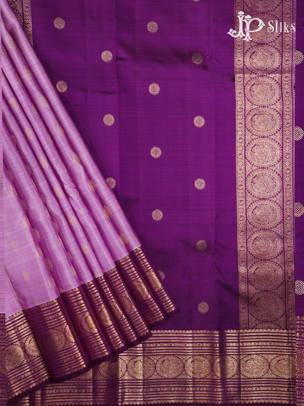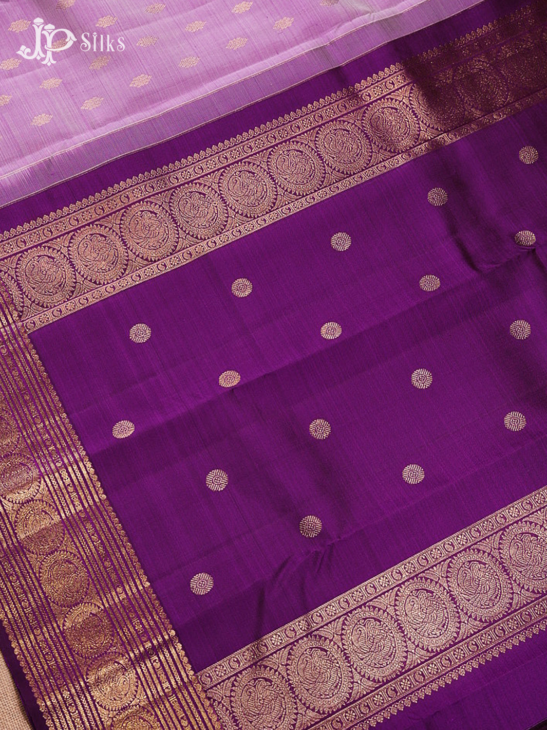 Regal Lavender & Deep Purple Kanchipuram Silk Saree from JP Silks captures graceful South Indian elegance with a lavender body adorned with small motifs, delicately enhanced by small mango designs, poo lines, and circle-inside annam motifs, all beautifully framed with a rich 2G gold zari border that adds classic depth. The deep purple pallu carries coordinated chakram motifs along with small mango accents, poo lines, and circle-inside annam motifs woven in radiant gold zari, creating a harmonious and intricate visual flow.
