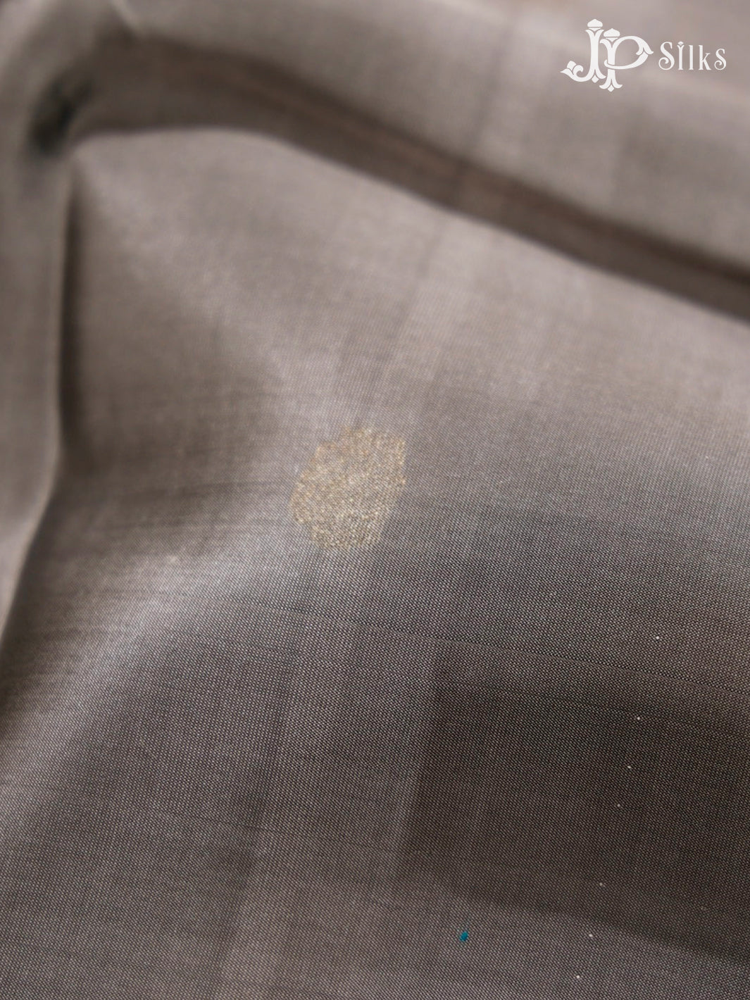 Elegant and Charming Grey and Rama Green Pure Silk Mix saree from JP Silks. The saree body features delicate small Gold zari buttas and a signature kuthirai (horse) floral design along its bottom edge, framed by a plain retta patta (double stripe) border. The contrasting Rama Green Pallu stands out with its intricate checked pattern. The ensemble is finished with the matching Rama Green Blouse piece, which is Plain but includes the elegant kuthirai floral design element and the plain retta patta border. This piece is perfectly suited for Traditional Wear or any formal ceremonial event.