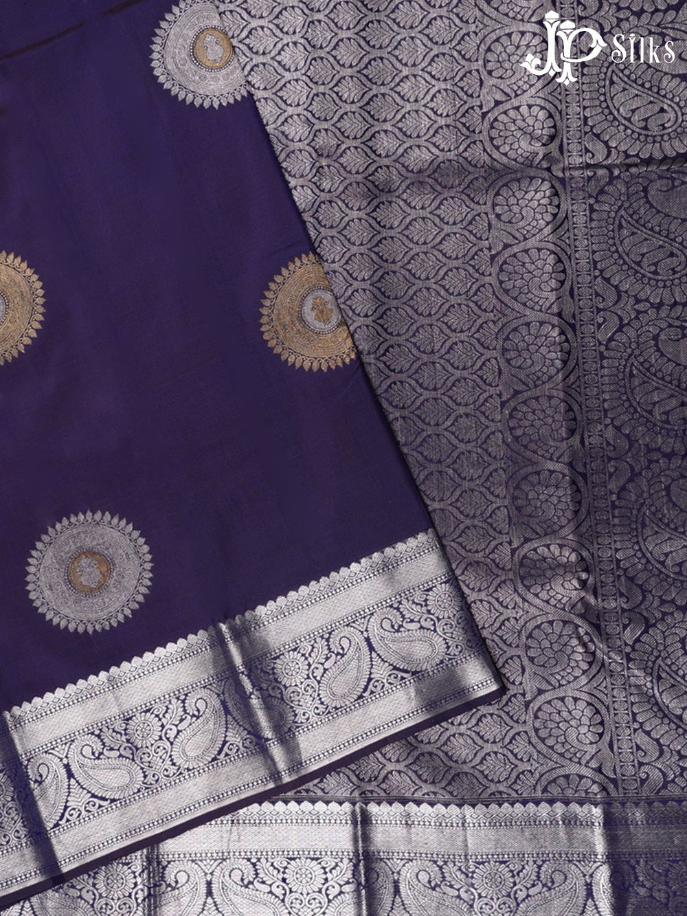 This stunning navy blue Kanchipuram silk saree in silver and gold zari features a body adorned with intricate chakram motifs, each encompassing the elegant iruthalai pakshi, or two-headed bird. The pallu is a masterpiece with an elaborate kodi design, mango motifs, and detailed leaf patterns, reflecting the exquisite craftsmanship of Kanchipuram weavers. Complementing this beautiful saree is a plain navy blue silk blouse with a matching border. The silver border of the saree, embellished with paisleys and floral designs, adds a touch of sophistication and grandeur, making it an ideal choice for special occasions.