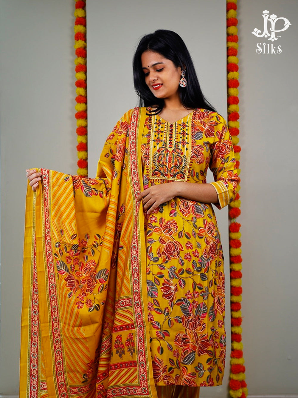 Brighten your wardrobe with this elegant Readymade Salwar Suit Set in vibrant yellow. The floral top features a mango-shaped thread work at the neckline, 3/4 sleeves, and a comfortable lining. Paired with straight-cut striped bottoms and a floral dupatta with cross lines, this soft modal ensemble is perfect for festive occasions and functions.
