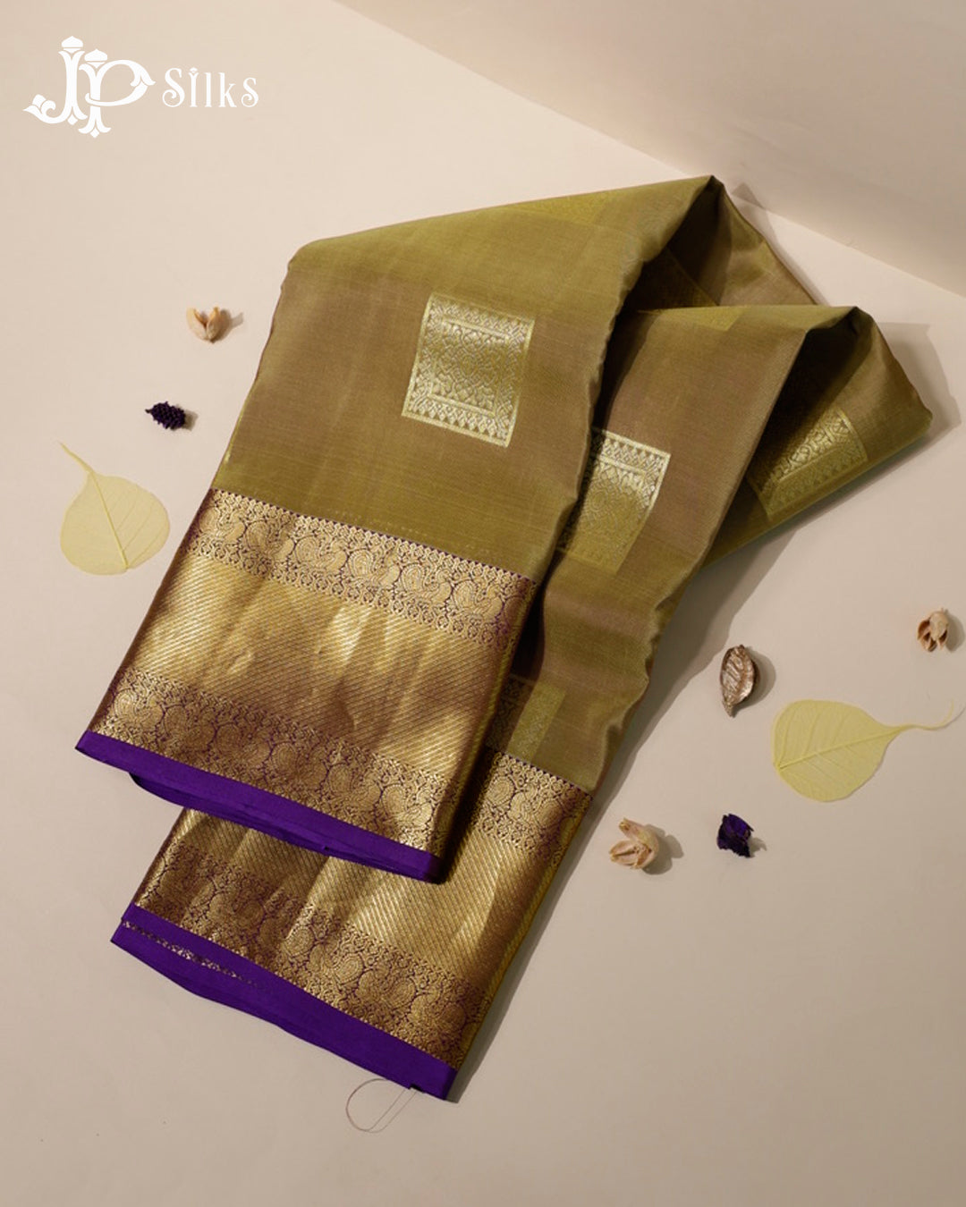 Elegant Olive Green & Dark Violet Pure Silk Mix Saree from JP Silks exudes timeless charm, featuring square-shaped floral buttas intertwined with annam floral designs, all framed by a subtle plain gold zari border that enhances the understated elegance of the body. The dark violet pallu showcases delicate floral patterns and traditional annam motifs, creating a refined contrast that draws attention to the intricate detailing. It is paired with a dark violet blouse, plain yet adorned with annam floral designs and a matching plain gold zari border for a cohesive and graceful finish. Perfect for weddings, festive occasions, and cultural celebrations.