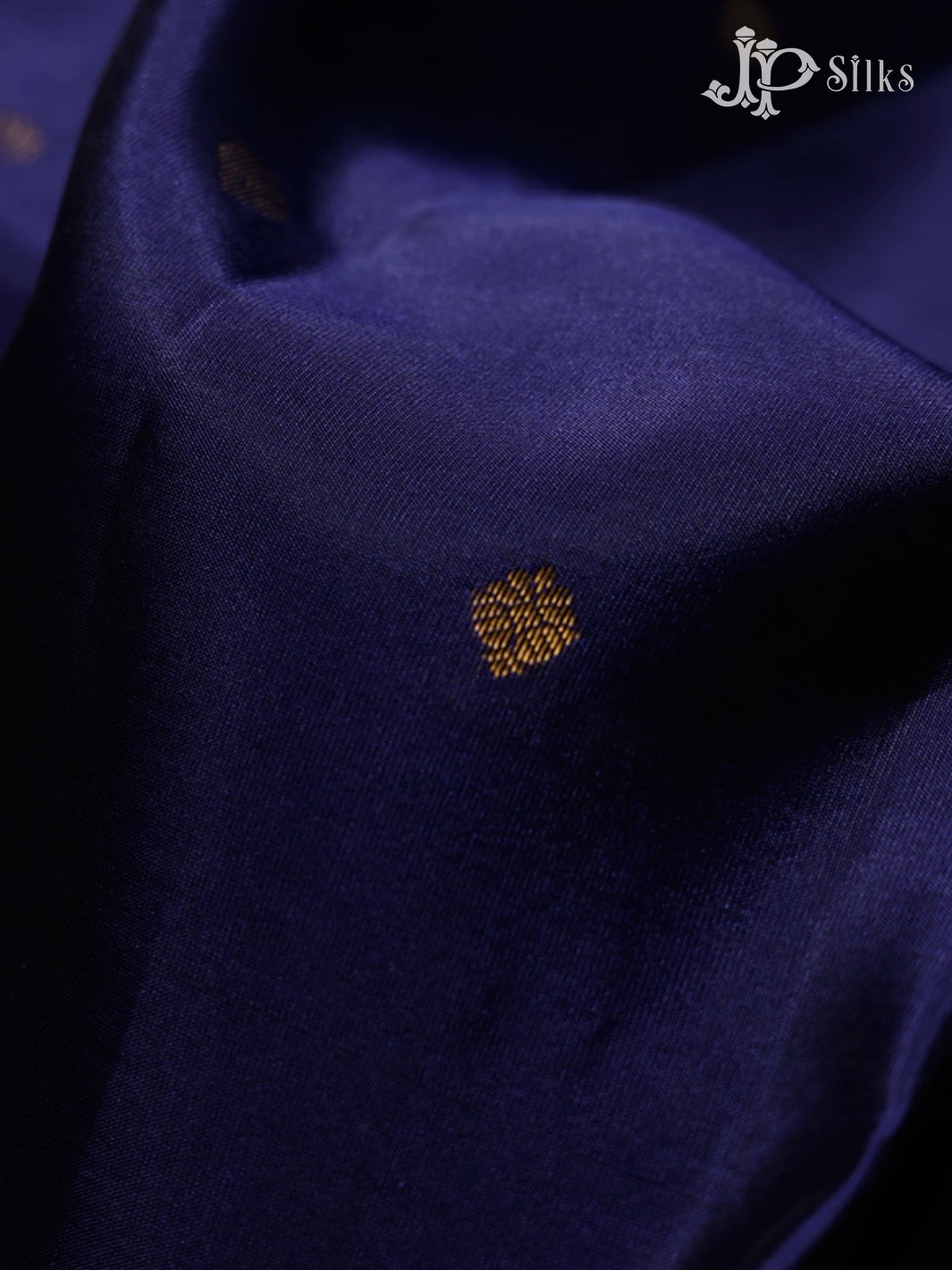 Elegant Dark Navy and Mustard Yellow Silk Mix Saree from JP Silks. body featuring small motifs of mango, checks, zigzag, and cross-line patterns accentuated by a lustrous gold zari border. The contrasting mustard yellow pallu showcases an intricate checked design that adds depth and character to the drape, while the plain mustard blouse is finished with matching gold zari borders for a cohesive look. Perfect for festive gatherings, cultural occasions, or elegant celebrations.