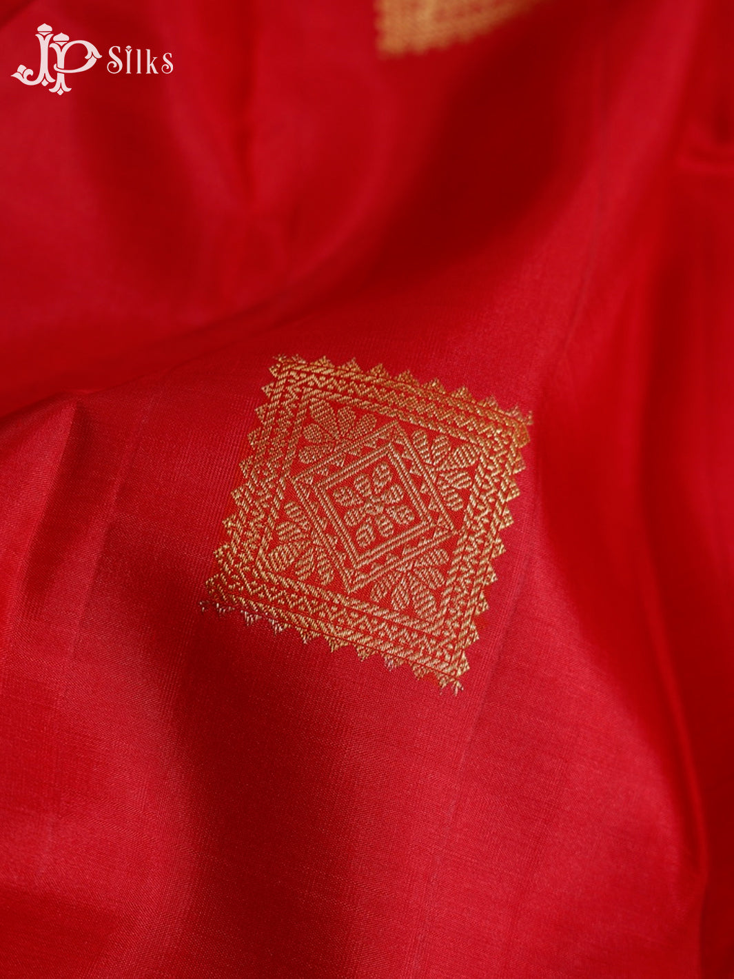 Regal Red & Manthulir Green Kanchipuram Silk Saree from JP Silks features a vibrant red body highlighted with square shaped floral motifs along with mango, poo chakram, and floral designs, finished with a classic plain gold zari border that enhances its traditional richness. The pallu comes in a contrasting manthulir green tone adorned with graceful floral patterns, yanai and mayil designs, and intricate small buttas that add depth and heritage charm.