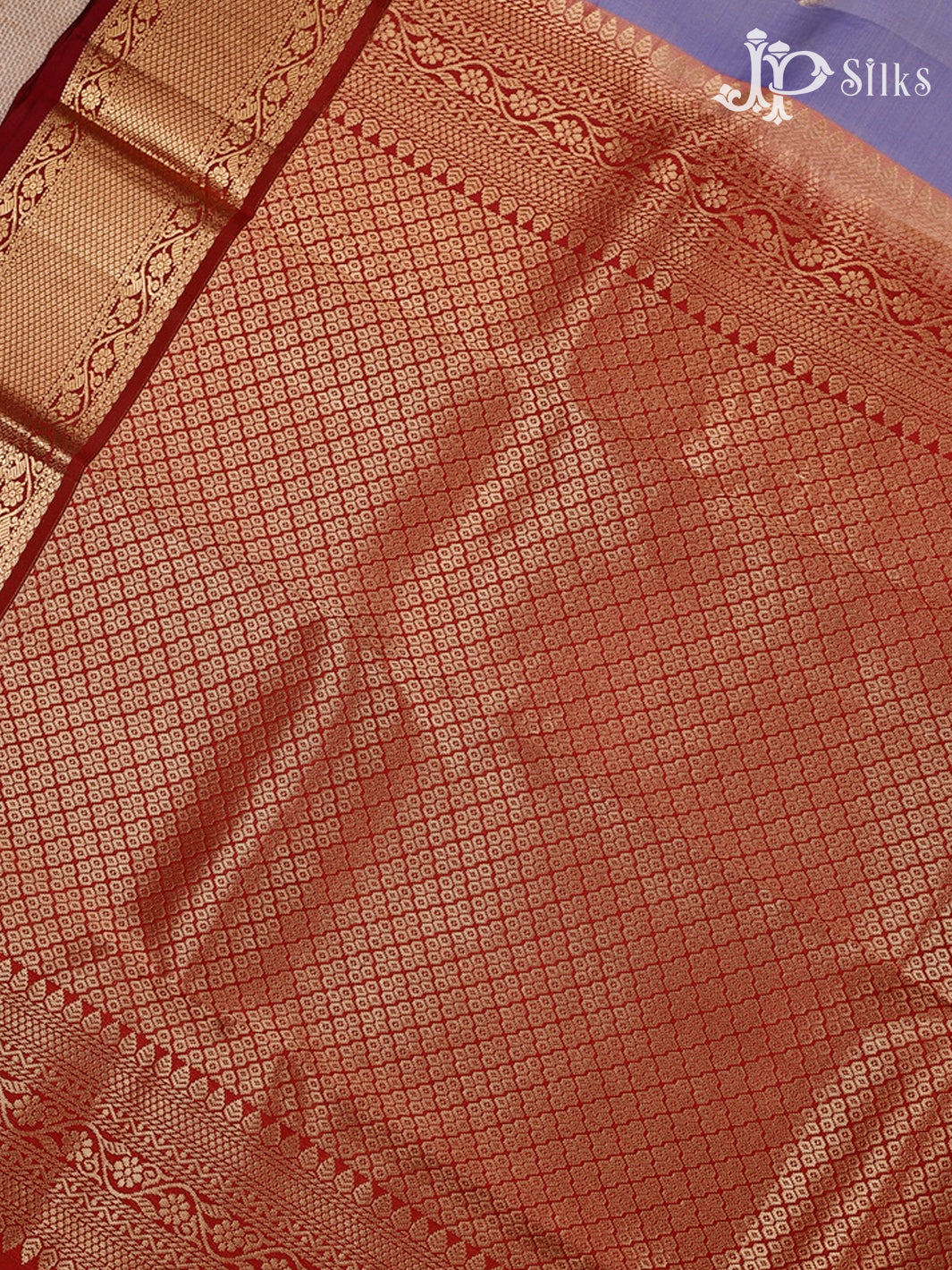 Woven in a gentle lavender hue, this Pure Mix Silk Saree is detailed with delicate floral motifs and framed by an intricately designed gold zari border. The maroon pallu enriches the drape with floral, zigzag, and fine woven patterns, adding a festive allure. Complemented by a plain maroon blouse edged with the same zari detailing, this saree is an elegant choice for ceremonial and special occasions.
