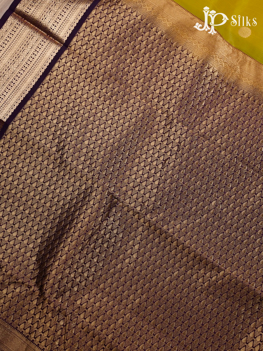 Bright and graceful, this Pure Mix Silk saree is designed to make every occasion special. The lemon green body is adorned with elegant small floral chakram motifs, framed by a rich gold zari border detailed with floral, zigzag, and interlock designs. The violet pallu adds contrast and grandeur with its intricate leaf patterns and fine detailing, making it the highlight of the drape. A plain violet blouse finished with the same zari border in floral, zigzag, and interlock designs completes the ensemble with traditional charm. A vibrant and festive drape that blends artistry with elegance, perfect for weddings, functions, and celebrations.