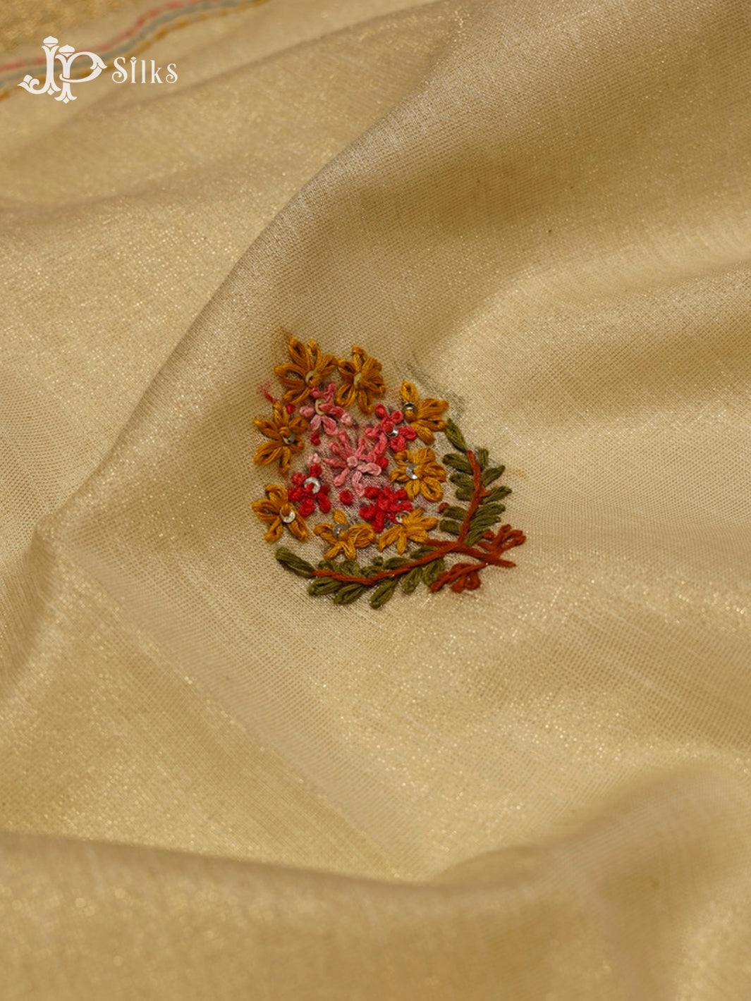 Graceful Off-White Linen Tissue Saree from JP Silks, The saree features floral thread motifs across the body with a small gold zari border. The pallu carries a floral design in delicate threadwork, creating an understated charm. Perfect for festive mornings, elegant functions, and intimate celebrations.